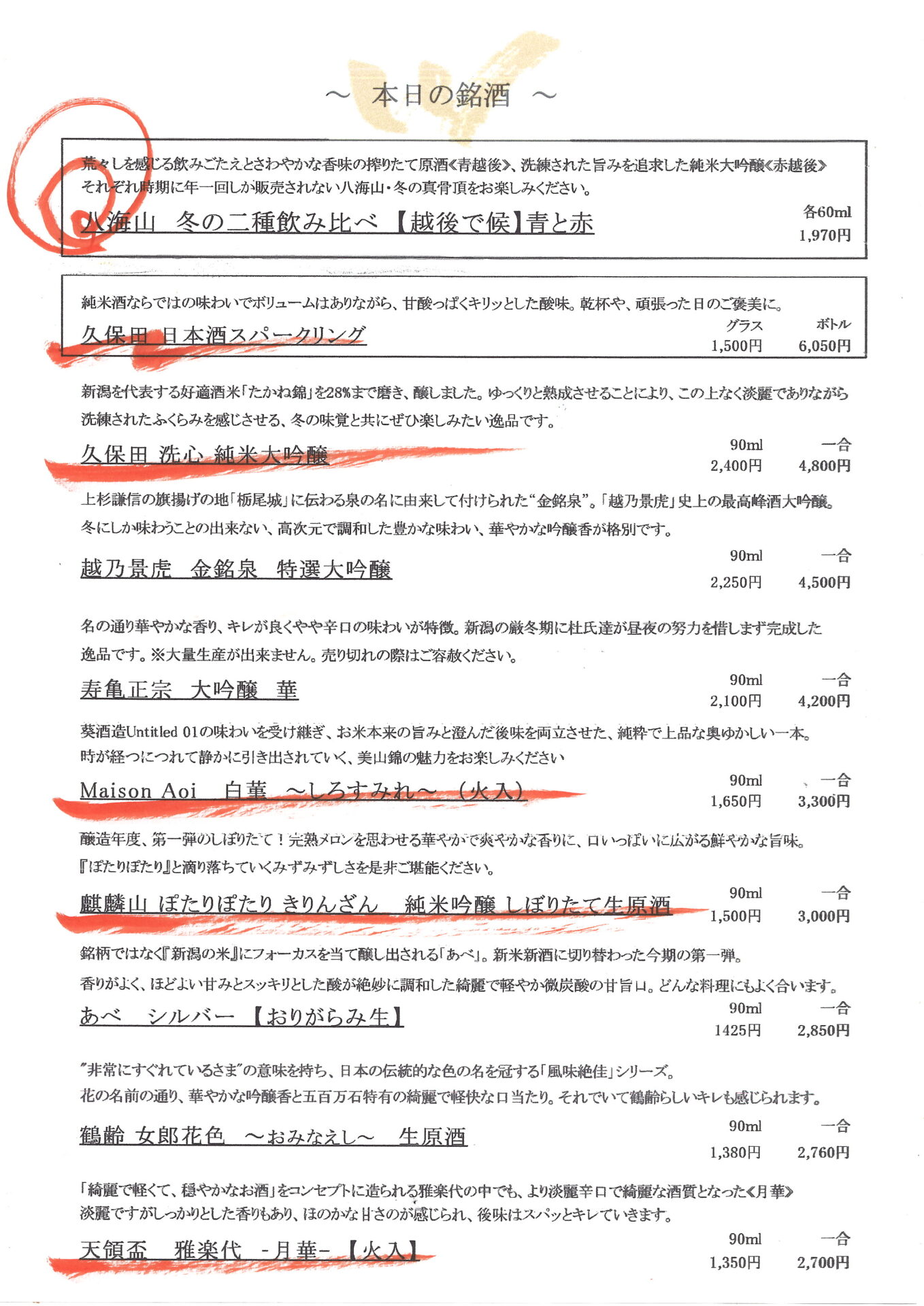 All-you-can-drink menu available for an additional with courses.